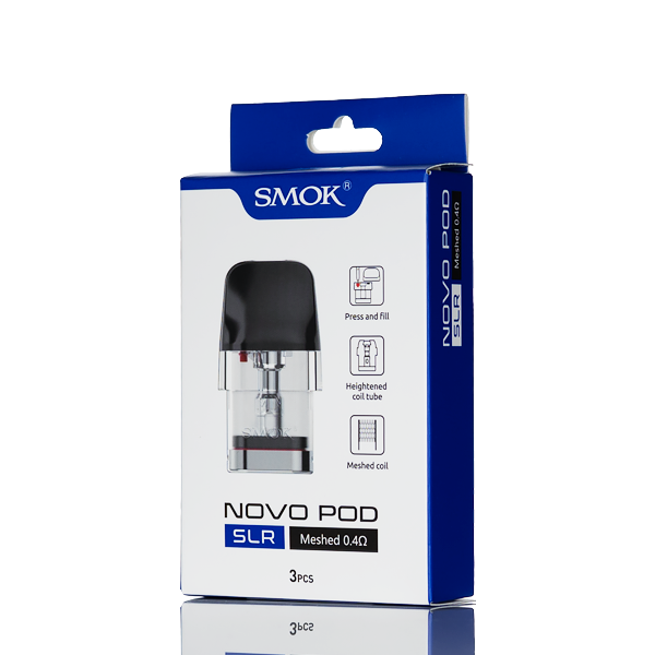 SMOK Novo SLR Replacement Pods, featuring a spring loaded top-fill system, a 2mL liquid capacity, an integrated coil design, and comes as a 3-pack of pods.